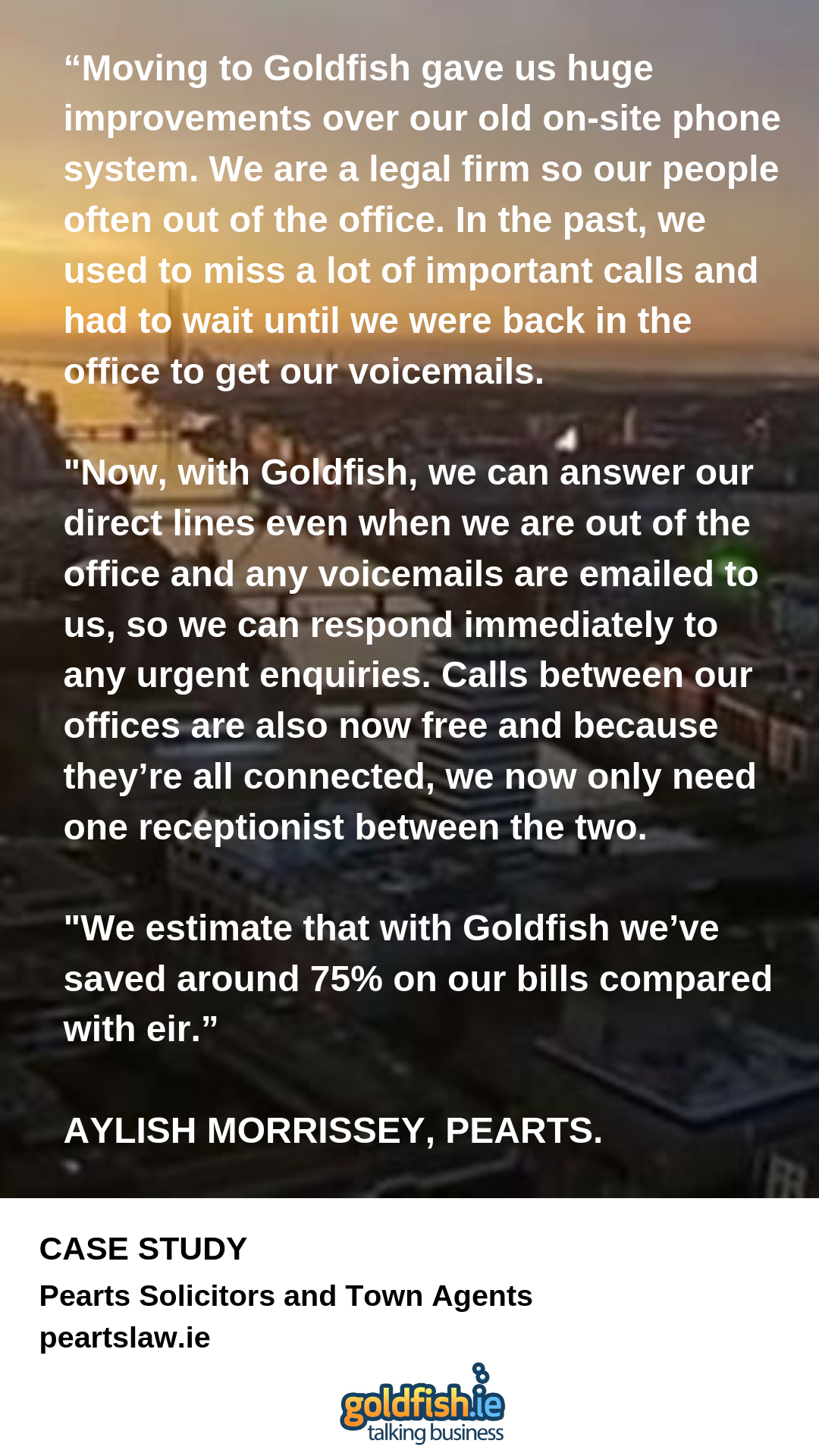 We recently posted our interview with Pearts Solicitors and Town Agents. Here is what Aylish Morrissey had to say about the impact Goldfish has had on the company.